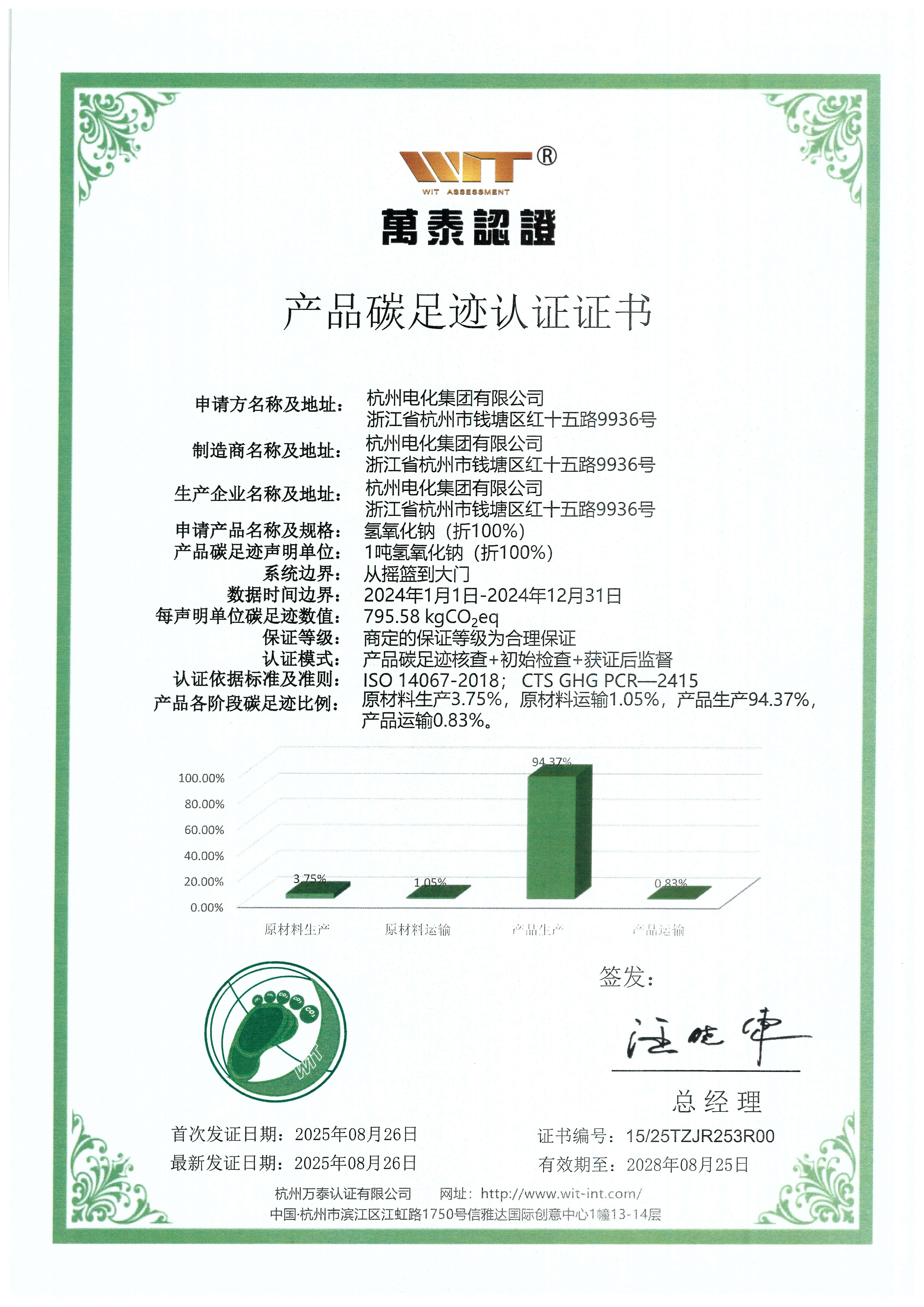 826日,杭電化氫氧化鈉(折100%)產(chǎn)品順利獲得碳足跡認(rèn)證證書,單位碳足跡數(shù)值為795.58千克CO2eq,這不僅標(biāo)志著杭電化首次完成產(chǎn)品碳足跡認(rèn)證,更使杭電化成為中國氯堿行業(yè)首批開展燒堿產(chǎn)品碳足跡認(rèn)證的生產(chǎn)企業(yè)之一。